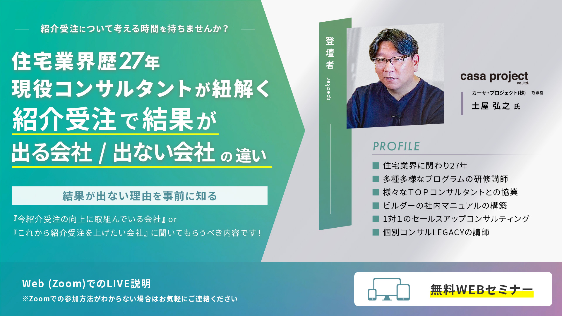TOP CONTENTS/コンテンツ セミナー・研修動画 セミナー・研修動画 セミナーアーカイブ 成長企業Interview 広告実践事例-ADNEWS casaの家ルームツアー お家とお金チャンネル 2024/7/11 社員の意識向上と能力の最大化に成功。経営陣主導の体質から総合力へのシフト 2023/12/12 紹介受注について考える時間を持ちませんか? 2023/11/22 成約率&受注単価向上の最適解 2023/10/20 これだけで大丈夫!獲れる平屋戦略教えます。 2023/7/25 【即効性マーケティング × 市場調査】初年度から22棟の受注実績